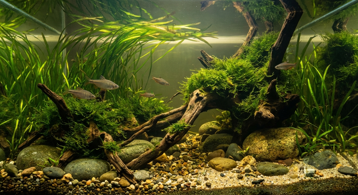 Beneath the surface of a Chinese biotope, the world is one of lush, verdant abundance. Vast meadows of "Jungle Grass" (Vallisneria) and thick curtains of Java Moss flourish in the nutrient-rich waters, providing a sheltered sanctuary for iconic species like the Goldfish and White Cloud Mountain Minnow. The substrate is a classic blend of fine river sand and smooth polished stone, reflecting the serene and balanced aesthetics of the East. This is a biome of rhythmic seasonal shifts, from the intense summer monsoons of the south to the crisp, clear winters of the north, representing the immense and timeless beauty of the Chinese landscape.