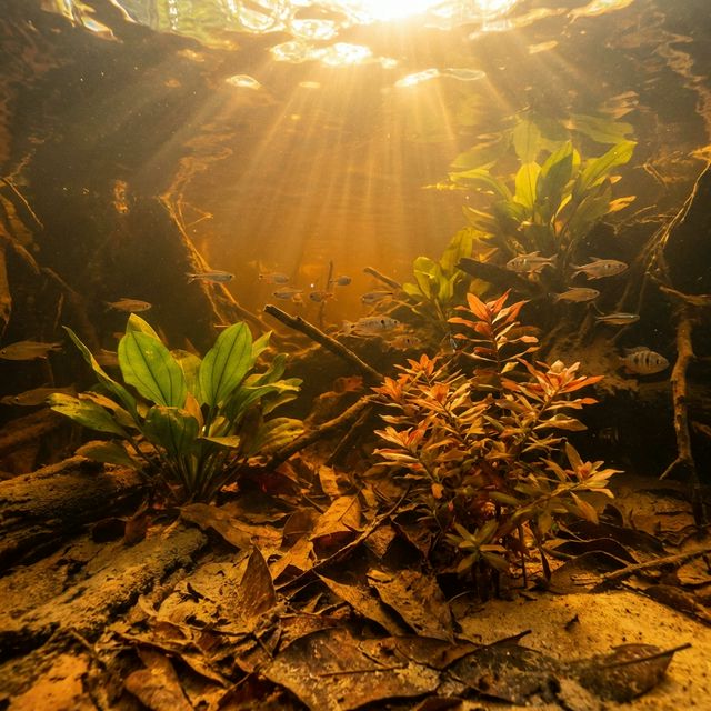 Beneath the surface, the Orinoco environment is defined by its soft acidity and the intricate debris shed by the forest canopy. Thick layers of leaf litter provide a nutrient-rich foundation for aquatic life, creating a complex, three-dimensional world where light flickers through the tannin-rich water column. The river's edge is a tangle of gnarled wood and swaying stalks, offering a sheltered haven for a staggering diversity of species that have adapted to the Orinoco's unique and ever-shifting conditions.