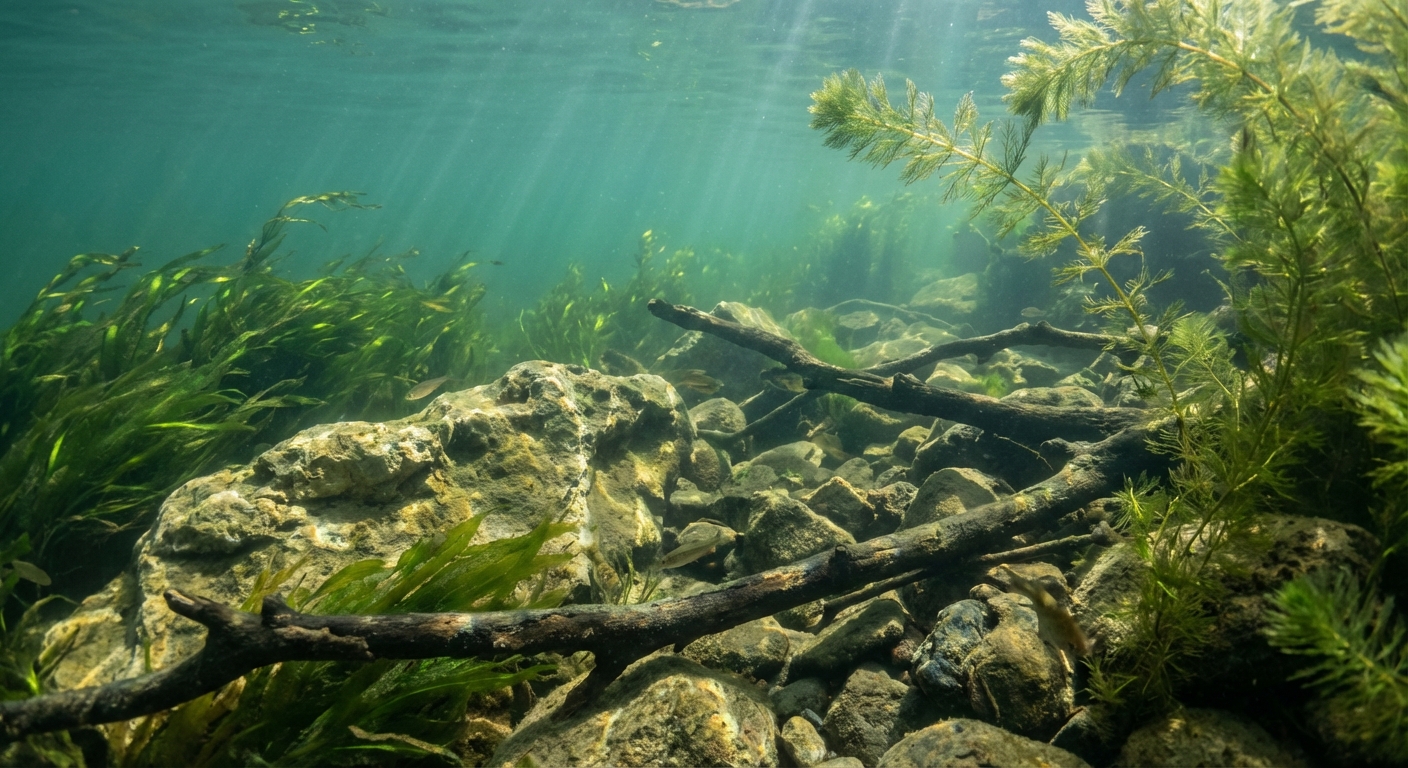 Beneath the surface of a Rhine biotope, life is a testament to resilience and elegance. Hardy thickets of Myriophyllum and the delicate fronds of Hornwort flourish in the nutrient-dense sediments of sand and silt, providing a sheltered sanctuary for iconic species like the European Perch and Pike. The substrate is a rich mosaic of river-worn gravel, fine golden sand, and weathered limestone, reflecting the immense geological variety of the river’s long journey. This is a biome produced by a unique blend of alpine energy and lowland abundance, offering a serene and beautiful window into the heart of the European wilderness.