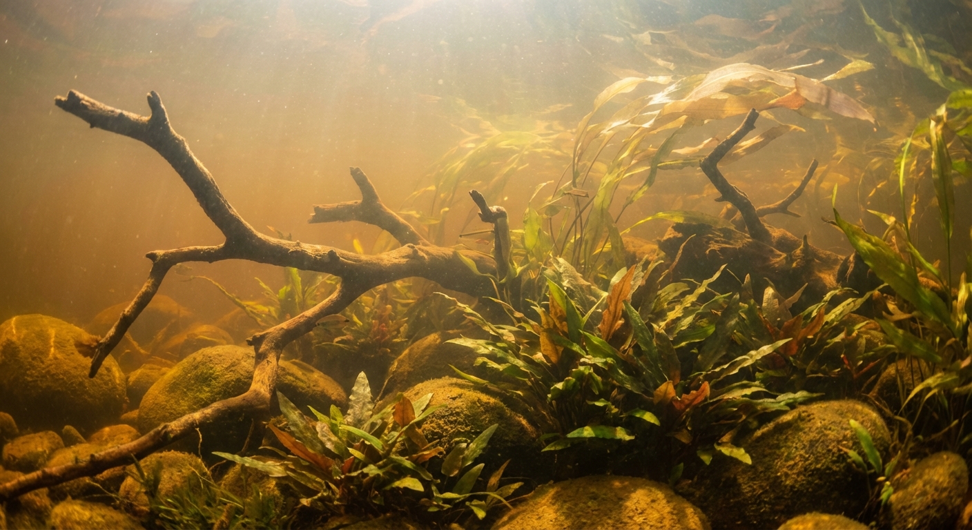 Beneath the emerald canopy of a Sri Lankan biotope, life is a masterclass in subtle beauty. Thick carpets of Cryptocoryne flourish in the nutrient-rich silt and fine sand, thriving in the dappled light of the forest floor. The substrate is a soft blend of fine river bed sand and organic debris, providing a nutrient-dense foundation for some of the world’s most beautiful aquatic flora. This is a biome of serene, rhythmic growth, where the seasonal monsoon brings a renewal of life to the shaded margins of its emerald islands.