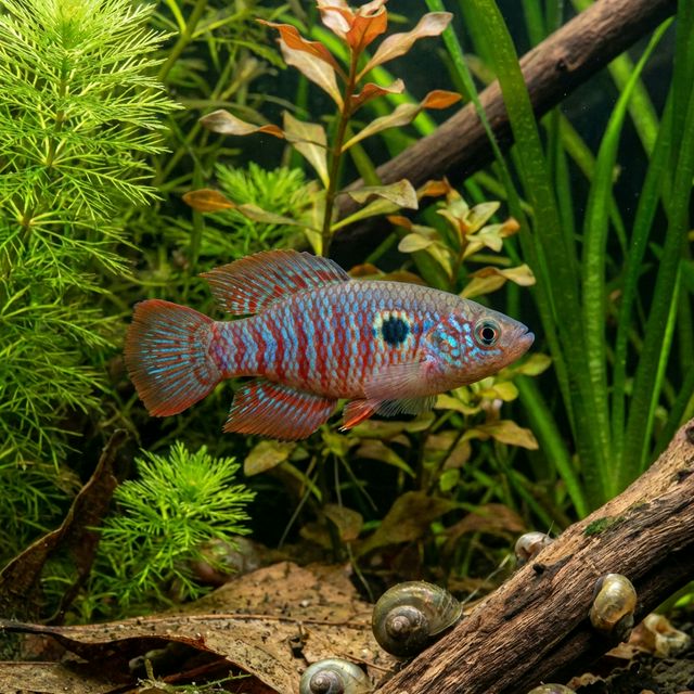 The American Flagfish is native to the warm, freshwater habitats of the southeastern United States, particularly found in Florida and surrounding areas. Thriving primarily in swampy regions, marshes, and slow-moving streams, these fish are adapted to a variety of water conditions but predominantly prefer shallow, heavily vegetated environments. The natural waters they inhabit exhibit characteristics of blackwater systems, often stained by tannins from decaying plant matter, which contribute to the overall acidity of their habitat.