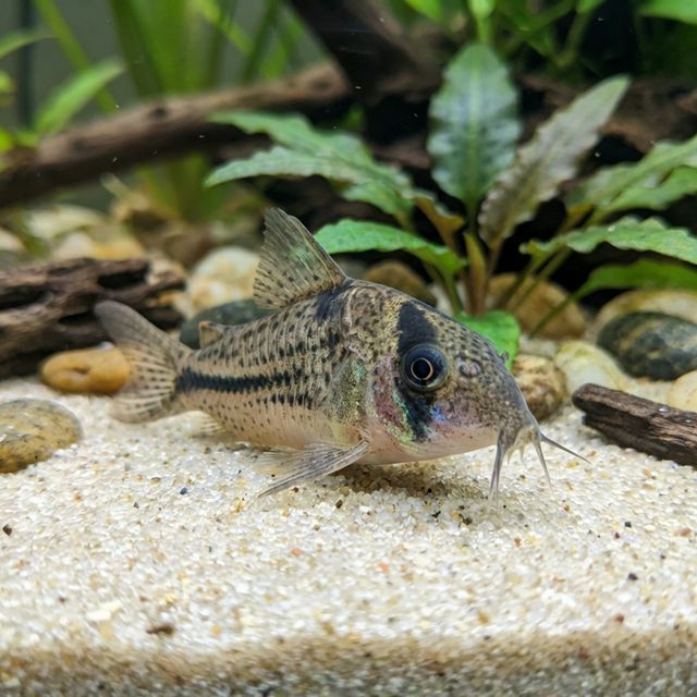 A simple, elegant corydoras with a dark black band. Hardy and active.