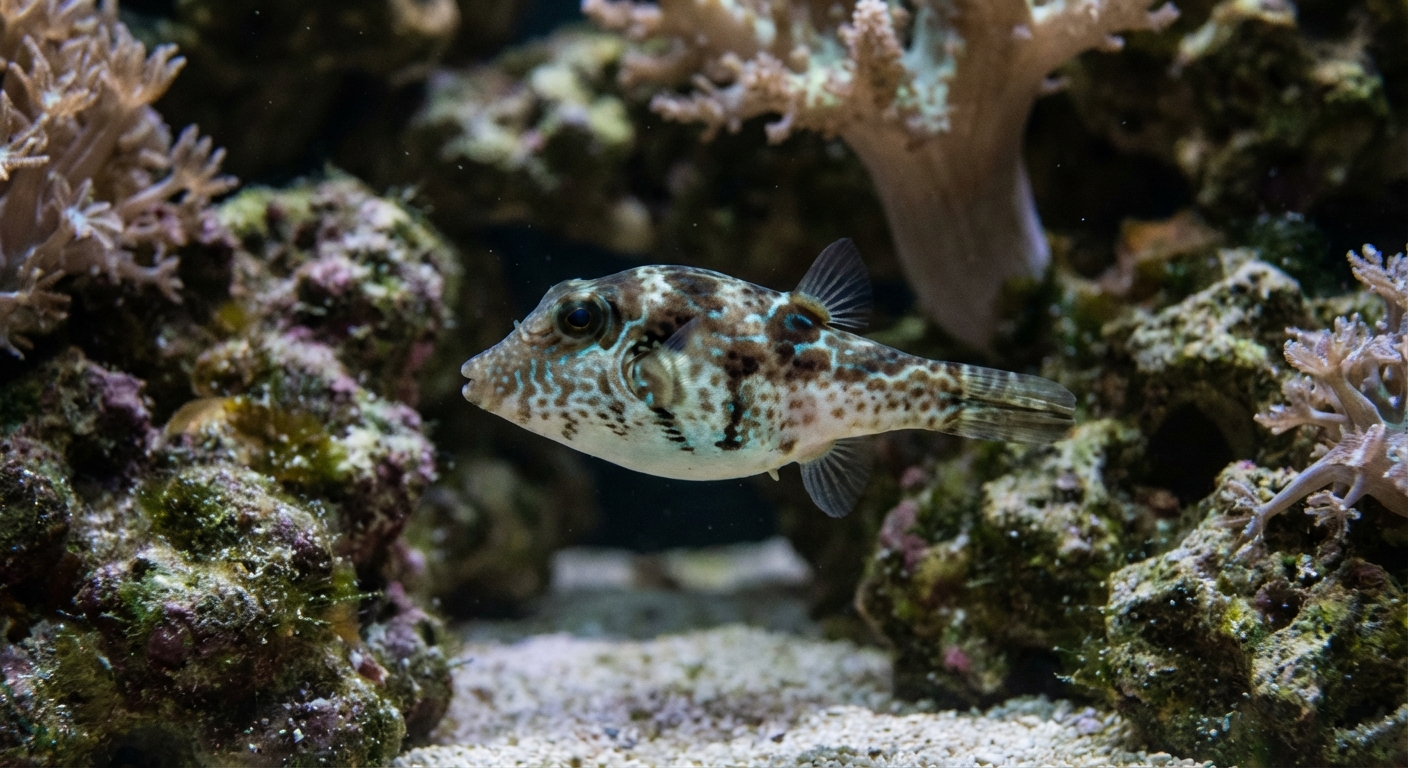 The natural habitat of this pufferfish is often composed of rocky substrates interspaced with coral formations that create vertical structures for exploration. The species is often found darting among the reef structures, showing a preference for areas enriched with algae, small invertebrates, and other potential food items. The clear waters of its native habitat contrast sharply with the often turbulent and turbid environments found in other aquatic ecosystems, further highlighting the importance of replicating these pristine conditions in captivity.