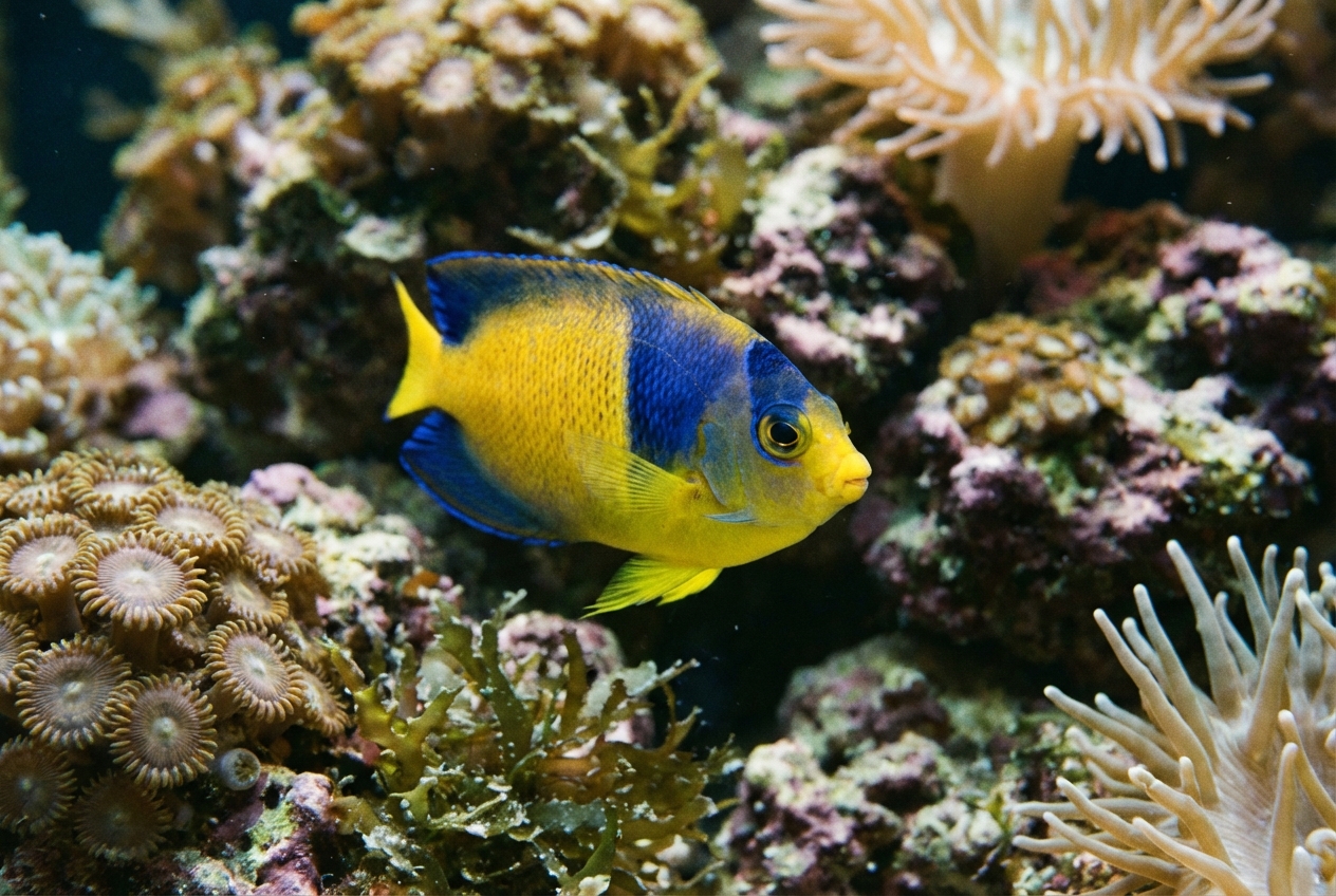 The Bicolor Angelfish (Centropyge bicolor) is a mesmerizing marine species native to the coral reefs of the Indo-Pacific region. Renowned for its strikingly vivid coloration, the Bicolor Angelfish exhibits a brilliant blue body that transitions into a bright yellow tail and belly, creating a stunning visual appeal that captivates aquarium enthusiasts. This unique coloration not only serves as an aesthetic marvel in home aquariums but also highlights its evolutionary adaptation in the wild, allowing it to blend into the vibrant reef environment while seeking shelter from predators.