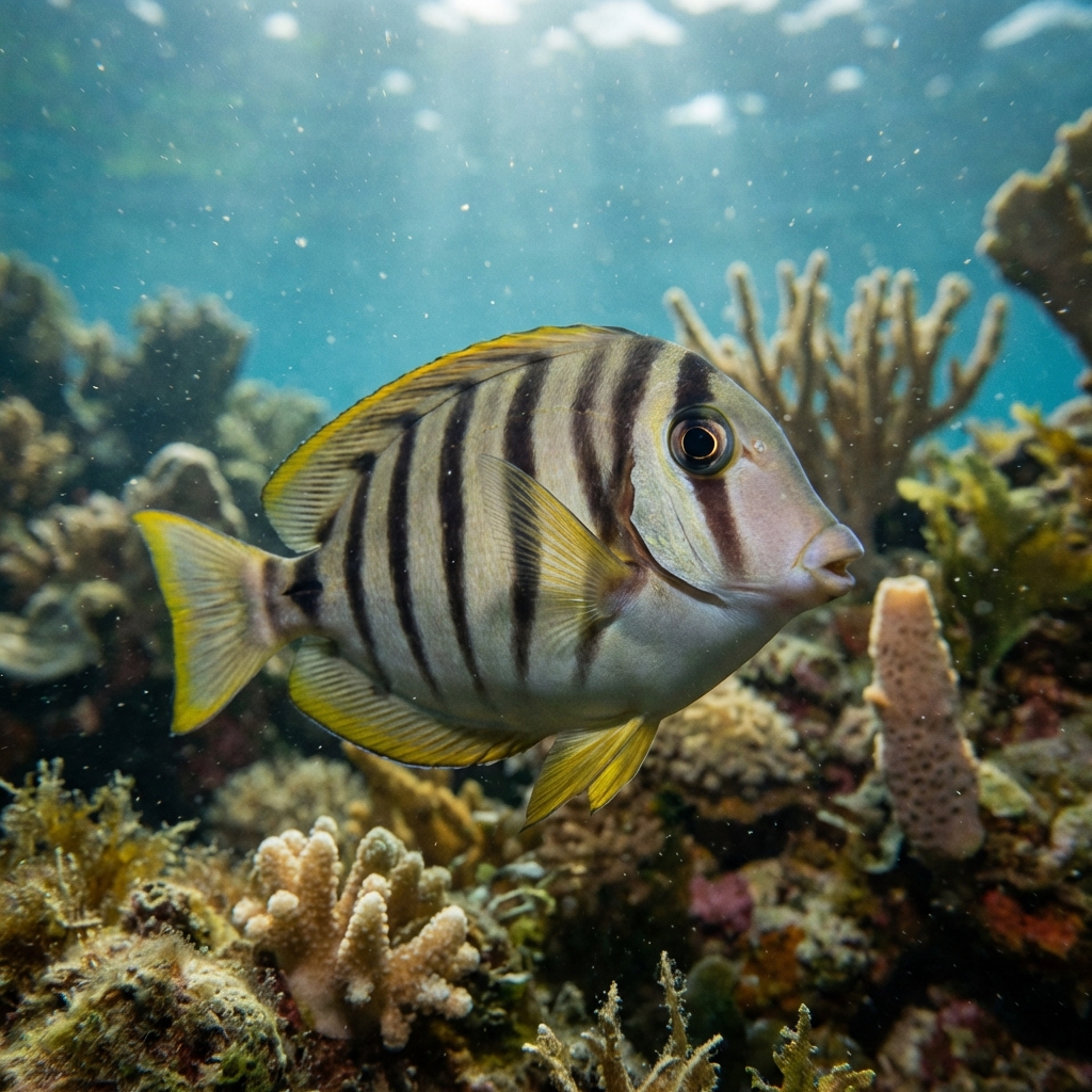 The Black-barred Tang is native to the reefs of the Indian Ocean, particularly around Madagascar, Mauritius, and the Seychelles. This region is characterized by warm, clear waters that are rich in biodiversity, providing a natural habitat with ample algae growth for grazing. The Black-barred Tang tends to inhabit shallow coral reefs, where it can easily find food, hide among coral formations, and interact with a variety of marine life.