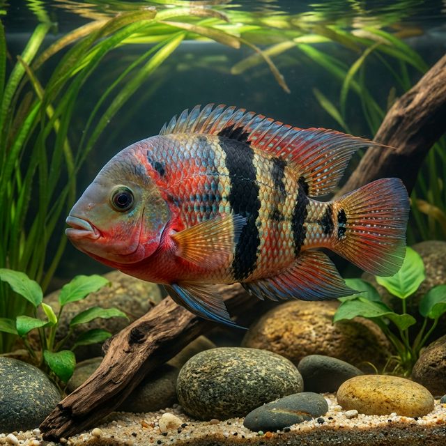 A large, powerful Central American cichlid with a distinct black vertical band. Requires a large aquarium.