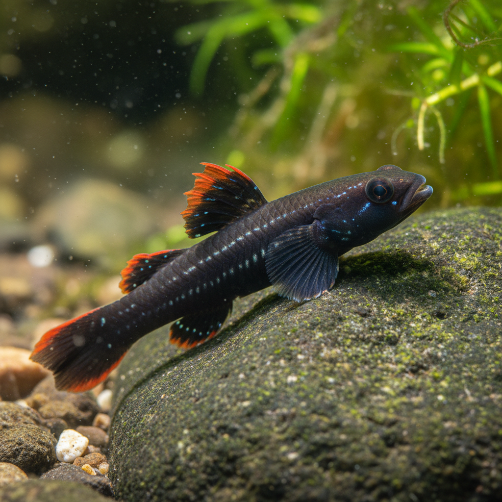The Black Toraja Goby originates from the Toraja region of Sulawesi, Indonesia, where it thrives in freshwater environments characterized by intricate rock formations, submerged vegetation, and gradual currents. These fish are typically found in blackwater rivers that are rich in tannins from decomposing plant matter, which impart a dark coloration to the water. The soft, acidic conditions that prevail in their natural habitat create an optimal environment for these gobies, which can be sensitive to sudden changes in water quality.