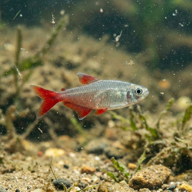 A silver tetra with striking blood-red fins. Very hardy and active surface swimmer.