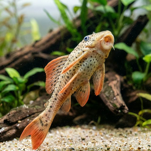 A distinct pleco with blue eyes and rusty red fins. Excellent scavenger.