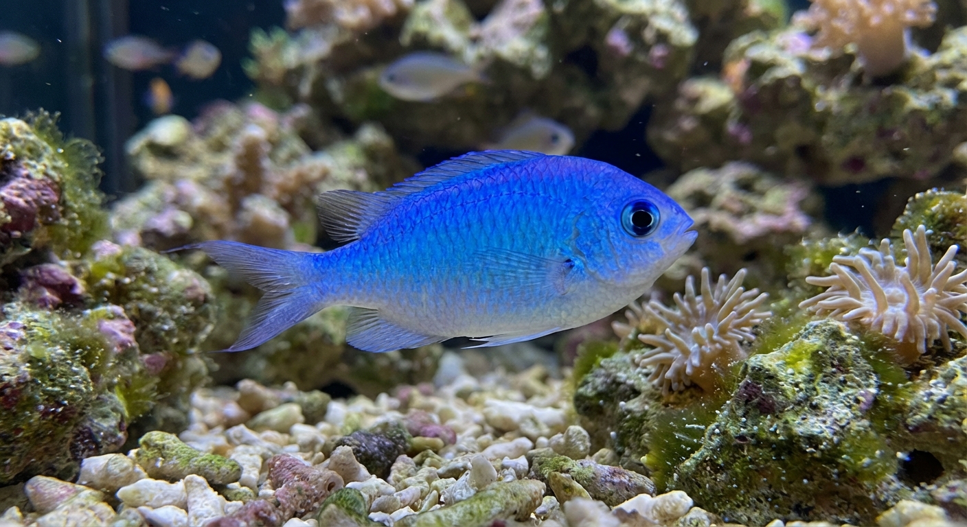 The Blue Reef Chromis (Azurina cyanea) is a stunning saltwater fish known for its unique appearance and behavior.