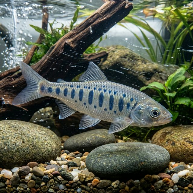 The Blue Spotted Hill Trout, scientifically known as Opsarius bakeri, is a striking freshwater fish that captures the attention of aquarists and enthusiasts alike. Its mesmerizing blue spots, which stand out vividly against its silvery body, add a splash of color and elegance to any aquarium setup. Apart from its visual appeal, the Blue Spotted Hill Trout is not just a pretty face; it plays an important role in the aquarium hobby, valued for its unique behavior and relatively manageable care requirements, making it an ideal choice for beginners and experienced aquarists alike.
