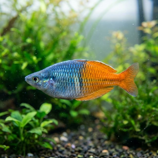 A stunning two-tone rainbow fish: half blue, half orange. The showstopper of the rainbowfish family that needs space to truly shine.