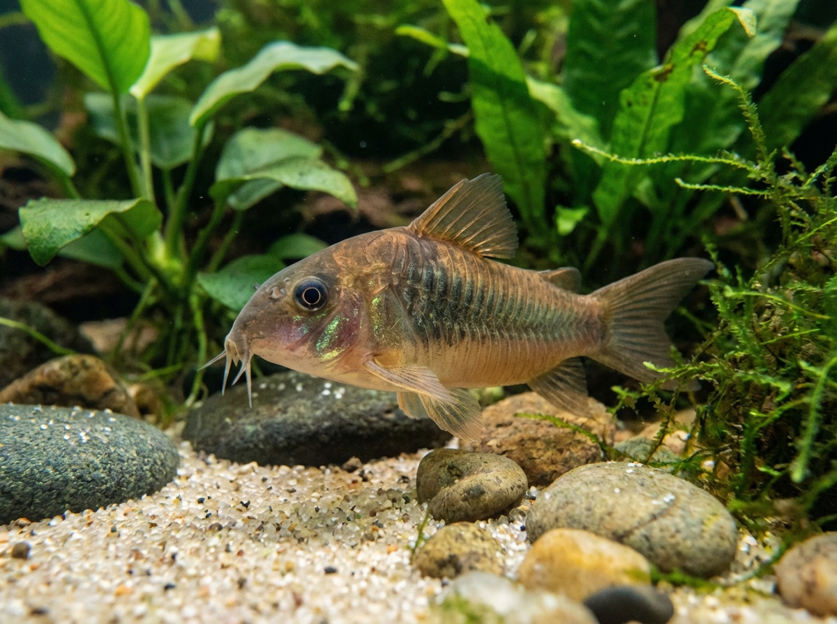Regarding tank setup, a minimum aquarium size of 20 gallons is suitable for a small group, as these fish prefer to be in schools of at least six. The substrate should be soft, such as fine gravel or sand, as the Bronze Corydoras often dig around looking for food. Ideally, the tank should be well-planted with hiding spots created by driftwood, rocks, and live plants to replicate their natural environment. While lighting can be moderate, it should not be too bright, as subdued lighting mimics their dark habitat and allows them to feel secure.