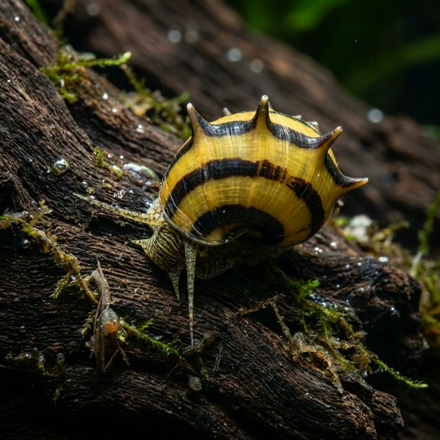 The Bumblebee Horn Snail, scientifically known as Clithon corona, is a visually striking freshwater snail that has rapidly gained popularity among aquarists due to its unique appearance and beneficial qualities in tank maintenance. Known for its vibrant yellow and black striped shell, reminiscent of a bumblebee, this snail adds a bold splash of color to any aquarium. They can grow up to 2 inches in diameter, and their coiled, horn-like shell structures make them a fascinating subject of observation for both novice and experienced aquarists. Beyond aesthetics, the Bumblebee Horn Snail also plays a crucial role in maintaining a healthy aquarium environment, as they consume algae and leftover organic matter, thereby contributing to the overall cleanliness and balance of the aquatic ecosystem.