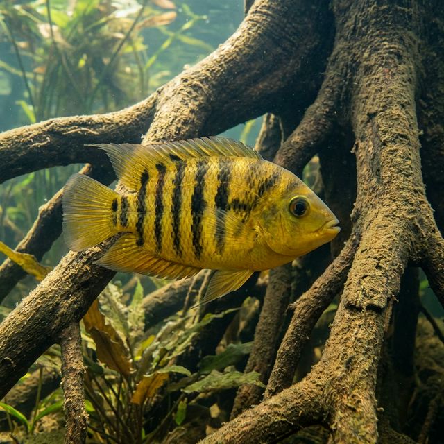 The Canara Pearlspot Chromide is primarily found in the freshwaters of the Western Ghats, a UNESCO World Heritage site that boasts a variety of habitats. The species thrives in a mix of water types, including both clear and slightly stained, blackwater environments typically filled with dense vegetation and submerged flora. The water in these regions is often soft and slightly acidic, with a pH range typically between 6.0 to 7.5. It is in such habitats that the Canara Pearlspot Chromide has adapted to make the most of the rich biodiversity, spending time among roots and debris where it searches for food and shelter.