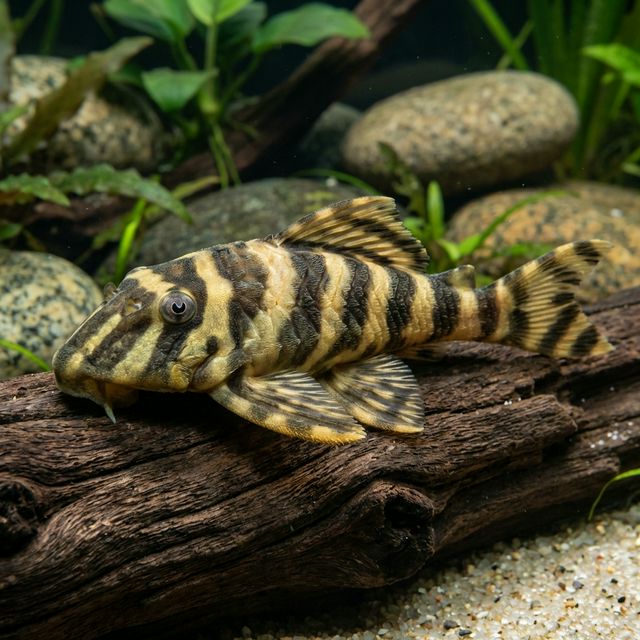 When designing the tank setup for the Candy Striped Plec, a minimum tank size of 100 liters (approximately 26 gallons) is recommended. The substrate should consist of fine sand or soft-gravel to protect their sensitive bristles. Incorporating driftwood, rocks, and caves will provide essential hiding spots and territorial spaces, while live plants help in creating a natural aquascape and contribute to water quality. Moderate lighting is best to mimic their natural environment, allowing plants to thrive without overwhelming the fish. This combination of elements will ensure the health and happiness of the Candy Striped Plec L015 in your aquarium.
