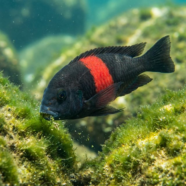 The Tropheus sp. Black Bulu Point is indigenous to Lake Tanganyika, one of Africa's Great Lakes, situated between four countries: Burundi, the Democratic Republic of Congo, Zambia, and Tanzania. This lake is characterized by its clear, mineral-rich waters that are considerably stable in terms of temperature and pH levels. Tropical in nature, the water temperature typically ranges from 23°C to 28°C (73°F to 82°F), and the mineral content contributes to a slightly alkaline environment, with pH levels generally between 7.8 and 9.0. The natural habitat of the Cherryspot Tropheus consists of rocky substrates and structures, allowing the fish to exhibit their natural behaviors such as hiding and grazing, which is crucial for their overall well-being.