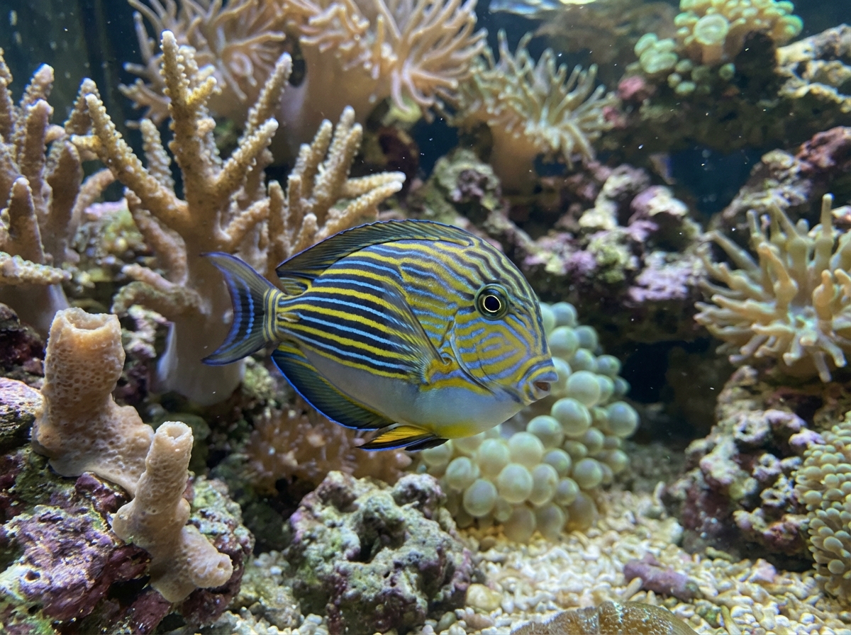 The Clown Tang (Acanthurus lineatus) is a stunning saltwater fish known for its unique appearance and behavior.