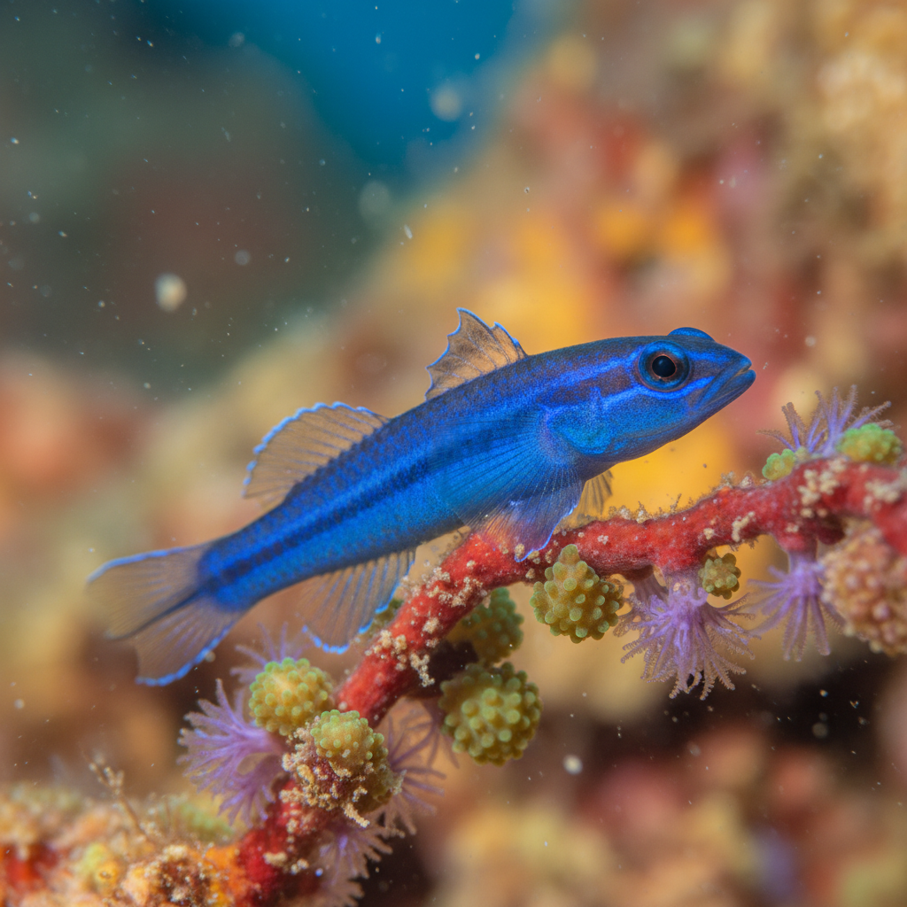 While they are generally non-aggressive, Cobalt Blue Gobies can show territorial tendencies, especially during breeding. It is crucial to provide ample space and hiding spots to minimize potential conflicts. Their social structure can be observed as they often exhibit vertical placement within the tank, resting on substrate and algae-covered surfaces but actively swimming mid-level and near the bottom during feeding or exploration.