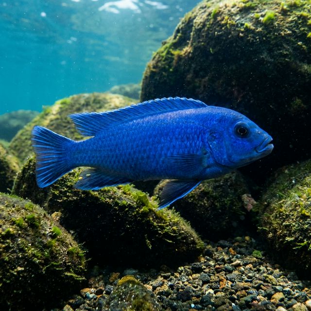 Cobalt Zebras originate from the rocky substrates of Lake Malawi in Eastern Africa, one of the largest and oldest lakes in the world. This inland lake is characterized by its clear waters and diverse aquatic habitats, providing an ideal environment for many cichlid species, including the Cobalt Zebra. The water here is typically alkaline with a pH range between 7.6 and 8.6, contributing to the cichlid's adaptability in aquariums when parameters are properly maintained. The natural habitat consists of rocky outcroppings, which provide hiding spots and territories for breeding and asserting dominance, making it vital for aquarists to replicate these conditions in captivity.