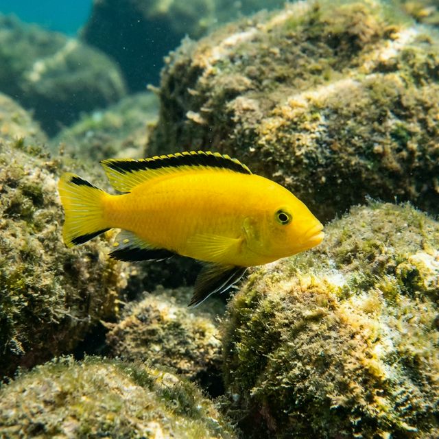 A yellow-bodied Mbuna from Lake Malawi. Active and robust.