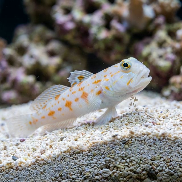 The Diamond Goby, also known as the Orange-Spotted Goby, is a captivating species renowned for its vibrant colors and unique behaviors. Hailing from the family Gobiidae, this fish is a small to medium-sized goby that displays a stunning palette of yellow to golden hues adorned with bright orange spots, giving it a diamond-like appearance. Its allure lies not only in its visual appeal but also in its fascinating behavior of burrowing and sifting through substrate, which impresses both novice and advanced aquarists alike. The Diamond Goby has gained significant popularity in the aquarium hobby due to its captivating presence and symbiotic relationships with other tank inhabitants.