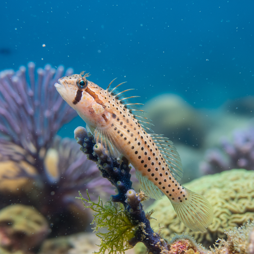 The Dot-Dash Blenny is commonly found among the crevices of rocks and corals, which not only provide shelter from predators but also contribute to its feeding habits by offering a suitable habitat for foraging. These environments are often characterized by stable water conditions, making them ideal for breeding and growth.
