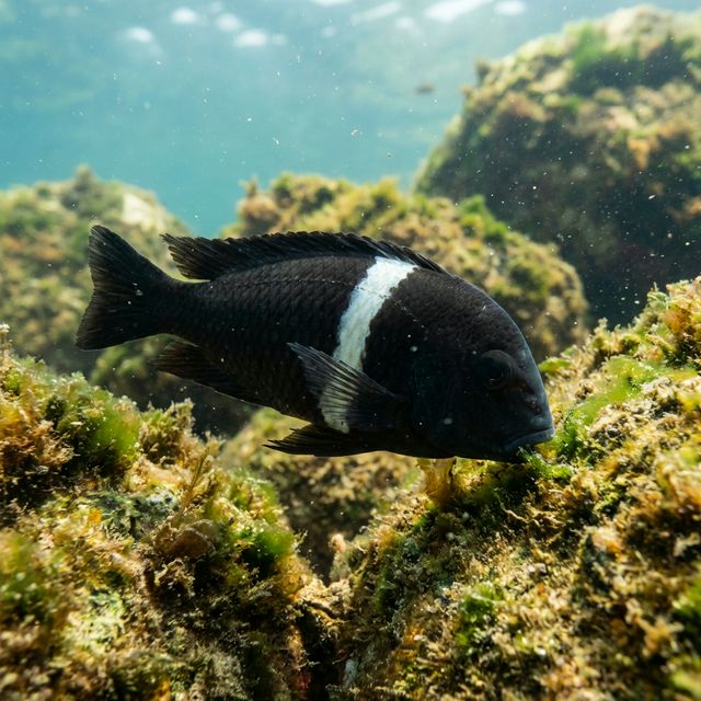 Juveniles are jet black with white polka dots. Adults turn dark with a bright vertical band. Iconic Tanganyikan.