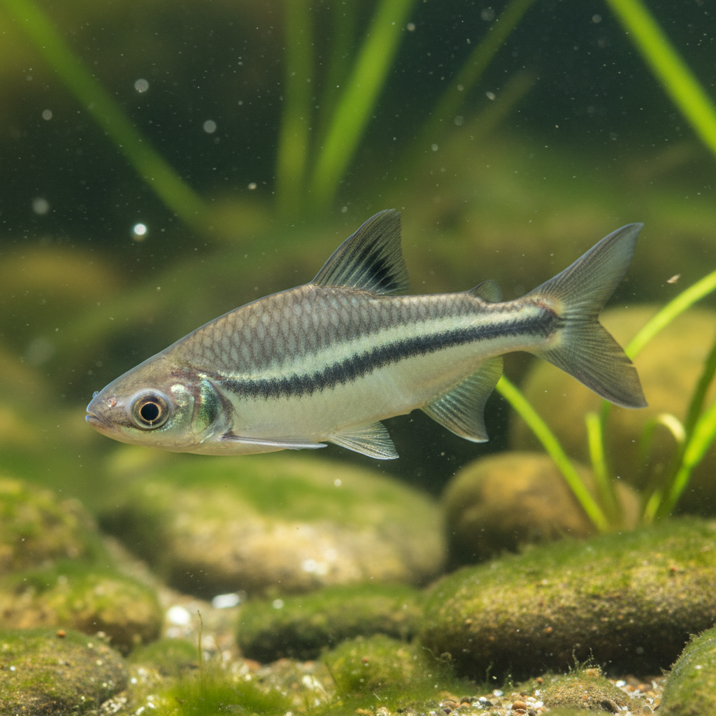 The Dwarf Pangasius, scientifically known as Pseudeutropius brachypopterus, is a captivating freshwater fish that belongs to the catfish family Pangasiidae. Recognized for its distinctive appearance, the Dwarf Pangasius showcases an elongated, laterally compressed body adorned with a series of striking vertical stripes that transition from a silvery-white to an iridescent blue hue as it matures. This visual appeal not only makes them a popular choice among hobbyists for display aquariums, but their remarkable adaptability to various water conditions adds to their charm in the aquarium trade. Their peaceful nature paired with an active swimming style captures the attention of both seasoned aquarists and newcomers alike.