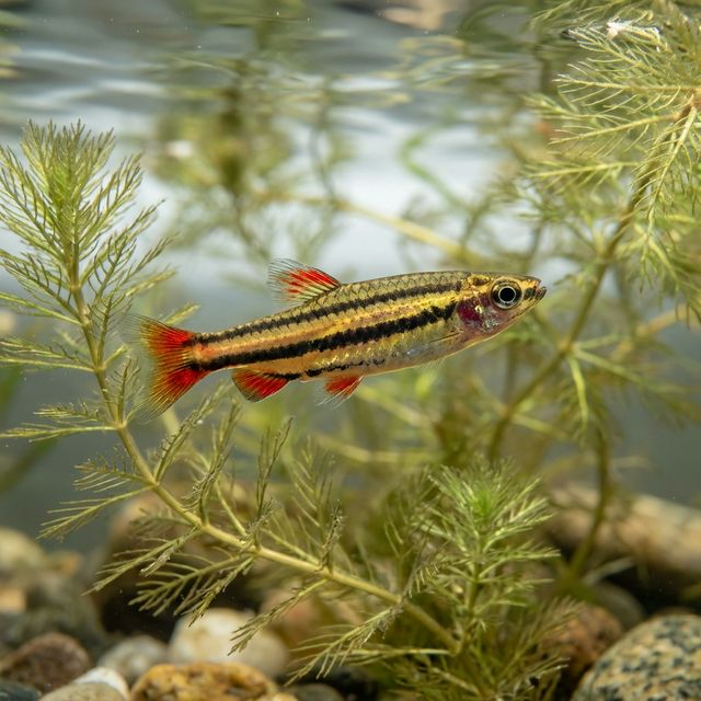 The Dwarf Pencilfish (Nannostomus marginatus) is a charming species native to the warm waters of South America, particularly found in the Amazon River basin. This small, elongated fish typically measures around 1.5 inches in length, making it an ideal choice for aquarists with limited space. Its slender body, adorned with a delicate golden stripe running from its snout to the base of its tail, is complemented by stunning iridescent scales that shimmer in various lighting. The Dwarf Pencilfish is not only visually appealing, but it also offers significant value in the aquarium hobby due to its peaceful demeanor and ease of care, making it suitable for both novice and experienced fish keepers alike.