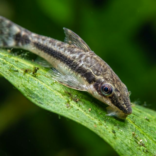 The Dwarf Suckermouth Catfish, scientifically known as Otocinclus sp., is a small freshwater fish that has become a favorite among aquarists due to its charming appearance and helpful algae-eating capabilities. Typically growing to a size of 1 to 2 inches, these fish have a slender, elongated body with a distinctive pattern of contrasting dark and light spots that provide camouflage in their natural habitat. Their gentle demeanor, coupled with their active behaviors, makes them a delightful addition to any peaceful community aquarium. The Dwarf Suckermouth Catfish is not only visually appealing, but it also plays a crucial role in maintaining aquarium health by keeping algae growth in check, which is vital for a balanced ecosystem.