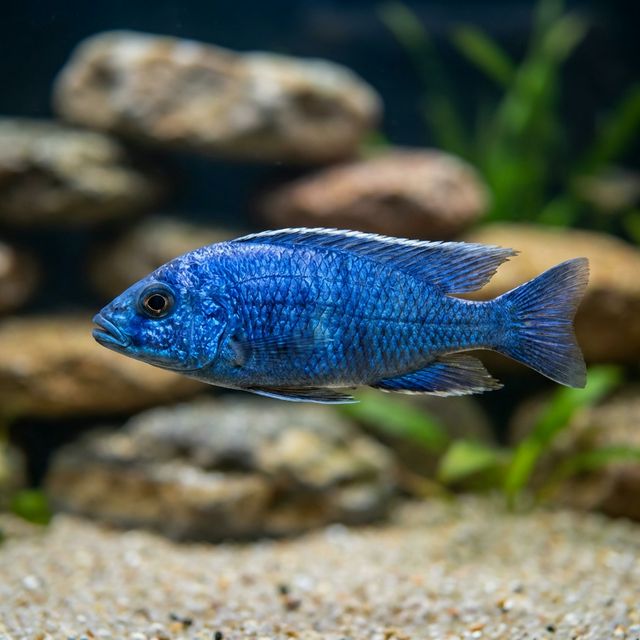 The Electric Blue Hap is known for its lively demeanor and displays moderate territoriality, especially males during breeding season. While generally not aggressive towards other tank mates, they may display signs of dominance or mild aggression if they feel their space is invaded. These fish typically prefer to occupy middle and lower water levels in the tank, frequently darting between rocky formations for refuge or as they patrol their territory.