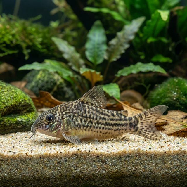 A beautifully marked corydoras with a bold stripe pattern. Peaceful bottom dweller.