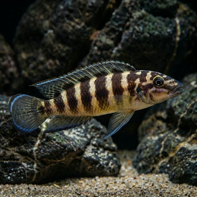 Chindongo sp. Elongatus Ornatus hails from the pristine waters of Lake Tanganyika, one of the oldest and deepest freshwater lakes in the world, located in East Africa. In their natural habitat, they dwell primarily in rocky substrates as well as sandy areas, often preferring depths between 15 to 30 meters. The water in Lake Tanganyika is typically alkaline with a high mineral content, which shapes the unique ecosystems of the lake. As a result, these fish thrive in conditions characterized by stable temperatures and relatively low organic matter, reflecting their adaptation to clear, mineral-rich waters. The specific ecological context of Lake Tanganyika significantly influences the care of the Ornate Elongatus in captivity, underlining the importance of replicating these conditions in an aquarium setting.