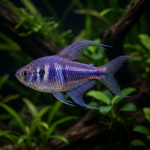 A regal tetra with a trident-shaped tail and purple/blue body. Males have stunning extended fin rays.