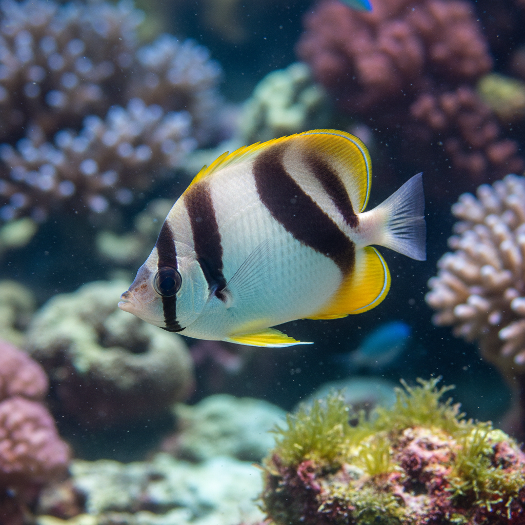 The ecological context of the Falcula Butterflyfish includes a preference for areas with abundant coral formations, where they can feed on the small invertebrates and algae that flourish in those environments. The inclusion of such habitats is vital in understanding the water conditions the Falcula Butterflyfish prefers in captivity, as replicating these aspects can lead to a more successful aquarium setting.