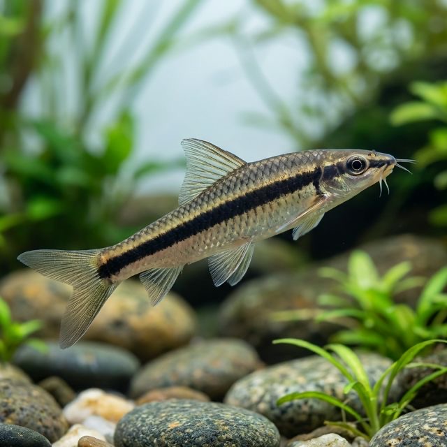 The False Siamese Flying Fox, scientifically known as Ceratogarra cambodgiensis, is a captivating freshwater fish that has gained popularity in the aquarium hobby for its unique appearance and active behavior. Often confused with the true Siamese Flying Fox, this species boasts a striking coloration featuring a gold to light brown body accentuated with a prominent black stripe running from the snout to the caudal fin. Its streamlined body and long, flowing fins add to its visual charm, making it a prized addition to many aquatic displays. Additionally, the False Siamese Flying Fox exhibits gentle, playful movements that provide a dynamic presence in the tank, captivating viewers.