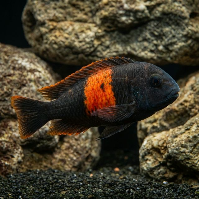 Tropheus sp. Red Moliro is indigenous to the rocky shores of Lake Tanganyika, which spans borders between four African countries: Burundi, the Democratic Republic of Congo, Tanzania, and Zambia. The fish primarily inhabits shallow waters that provide abundant rocky structures, which serve both as feeding grounds and shelter from predators. In this environment, the water is typically clear with a neutral to slightly alkaline pH and has a hardness ranging between 10 to 20 dGH.