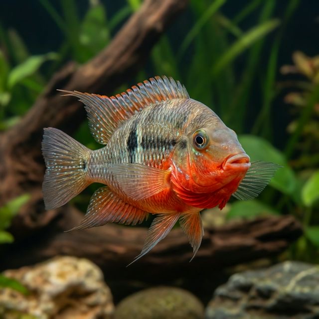 The Firemouth Cichlid, scientifically known as Thorichthys meeki, is a stunning freshwater fish native to Central America, particularly found in rivers and lakes in Belize, Honduras, and Guatemala. This species is especially esteemed in the aquarium trade due to its vibrant coloration and fascinating behaviors. The male Firemouth Cichlid exhibits a striking array of bright orange to red coloration on the lower part of its body and gills, which contrasts beautifully with its blue-gray body. Females are often less colorful but still possess subtle hues that contribute to their overall appeal. Their vivid colors, coupled with dynamic swimming patterns, make Firemouth Cichlids a captivating addition to any community aquarium.