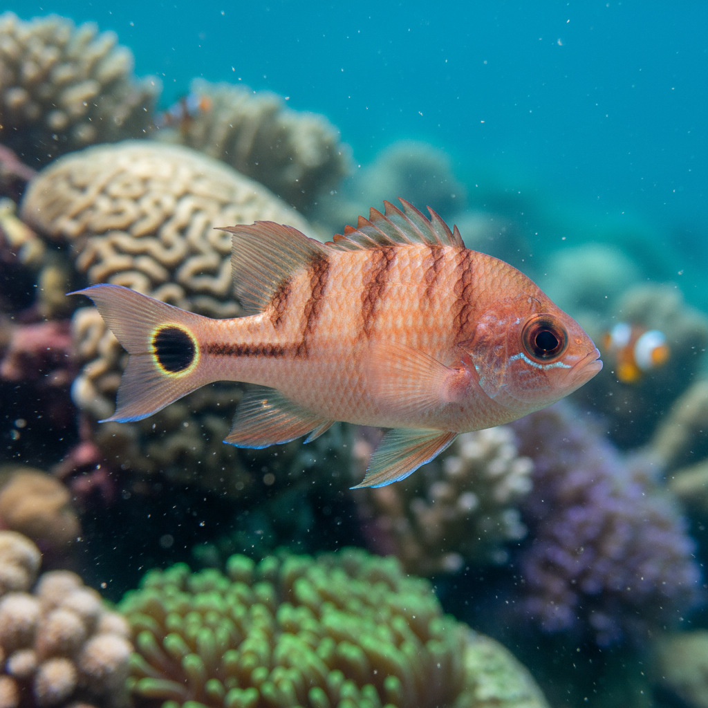 In its natural habitat, the Five-lined Cardinalfish resides at depths ranging from 1 to 20 meters, often found among coral crevices or rocky outcrops. The environmental context around the coral reefs is vital for this species, as it relies on complex ecosystems that provide food and protection. These habitats support a varied diet rich in zooplankton, tiny crustaceans, and small larvae, which the fish skillfully captures at dusk when it becomes more active. Understanding the Five-lined Cardinalfish's natural habitat is crucial for aquarists looking to replicate its requirements in a home aquarium.