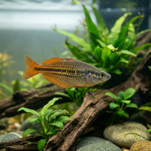 In terms of tank setup, providing a sandy or fine-grained substrate simulates their natural environment. Incorporating plenty of live plants, such as Java Fern and Anubias, along with driftwood and rocks, creates hiding spots and enables natural foraging behaviors. Lighting should be moderate; while Fly River Rainbowfish do appreciate bright light to enhance their color, they also benefit from shaded areas created by plants and decorations where they can retreat.