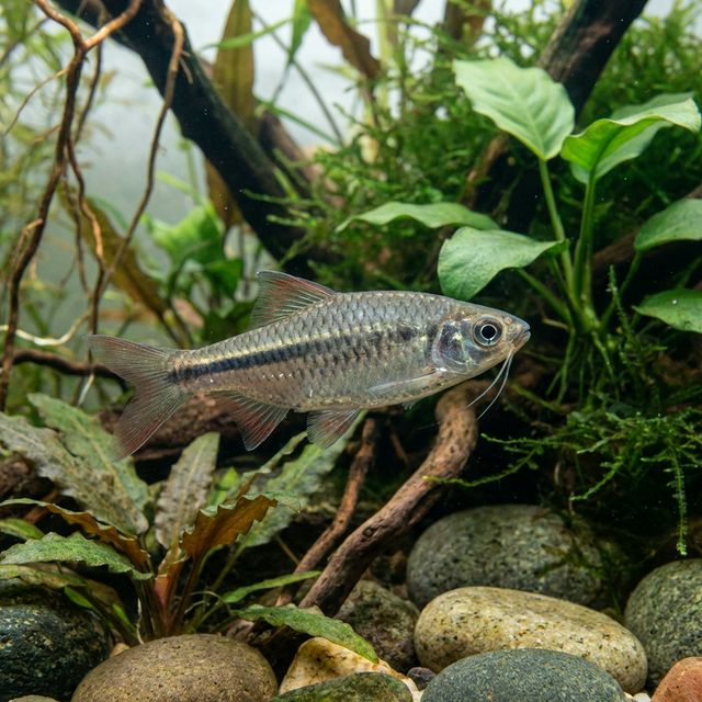 A surface-dwelling barb with extended pectoral fins. Can actually glide short distances.