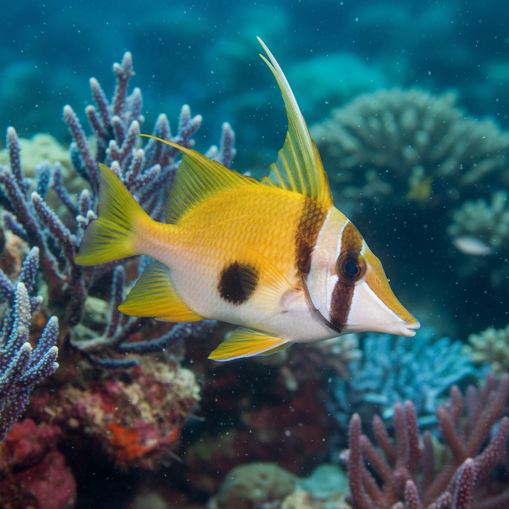 A bright yellow herbivore with a distinctive black-and-white patterned face. Excellent at eating algae, reef-safe, and armed with venomous dorsal spines.