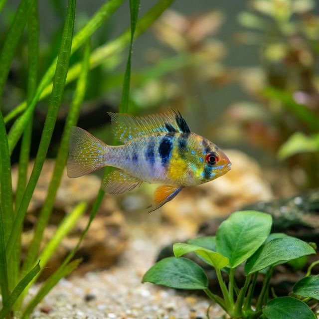A small, brilliantly colored South American dwarf cichlid. Electric blue, golden, and red markings make it one of the most visually stunning freshwater fish.
