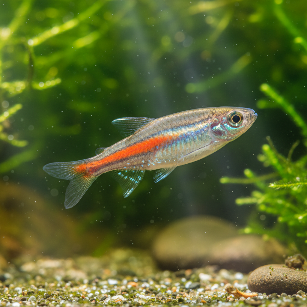 The Glowlight Danio originates from the freshwater rivers and streams of Myanmar (Burma) and Thailand. These fish are commonly found in slow-moving waters, often surrounded by lush vegetation that offers shelter and breeding sites. They thrive in habitats characterized by clear to slightly tinted water conditions, often with a slightly acidic to neutral pH. The natural environment includes soft, slightly warm water enriched with organic matter from decaying plant material, which contributes to its blackwater habitats. This depth of habitat knowledge is vital for recreating suitable conditions in an aquarium setting.