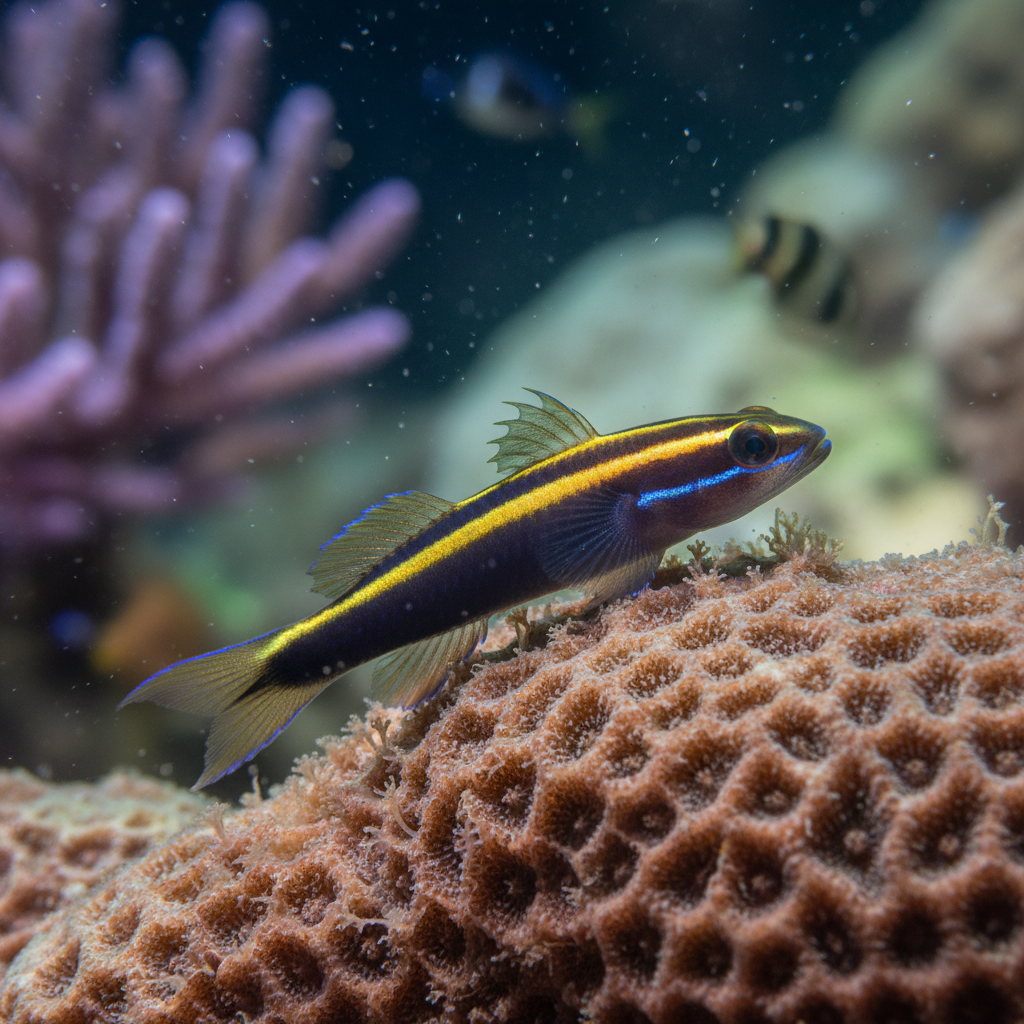 The Gold Neon Goby is native to the coral reefs of the Caribbean Sea, specifically around areas such as the Bahamas and throughout the Florida Keys. This region is characterized by warm, shallow waters where these fish thrive among the coral structures. They inhabit microhabitats that include rocky crevices and sandy bottoms, which provide shelter and protection against predators. Additionally, the Gold Neon Goby prefers clear, well-oxygenated waters typical of reef environments, which influences their health and behavior in captivity.