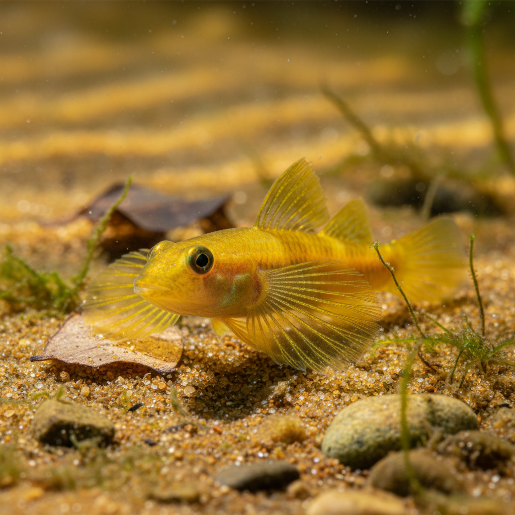The Golden Malili Goby (Mugilogobius sarasinorum) is a small but breathtakingly beautiful fish from the ancient Malili Lakes system on the island of Sulawesi, Indonesia. Specifically endemic to Lake Matano, it is prized by enthusiasts of Sulawesi biotope tanks for its vibrant golden body, which often features subtle dark markings or bands.