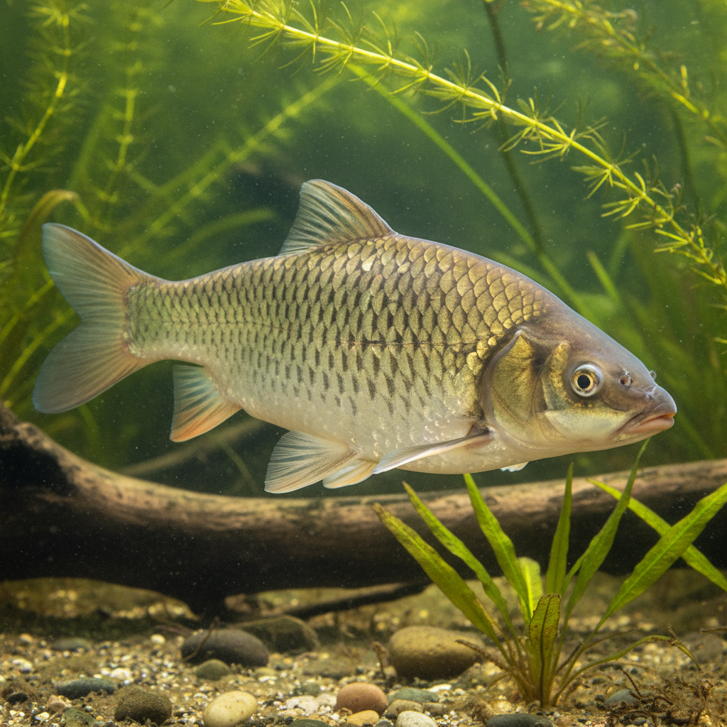 The Grass Carp (Ctenopharyngodon idella) is a massive, torpedo-shaped herbivore famous for its incredible ability to consume aquatic vegetation. It is a pond-scale species that grows far too large for standard home aquariums.