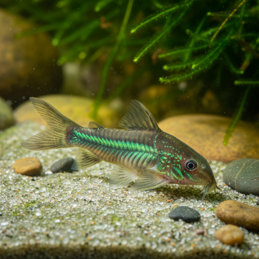 The Green Laser Cory (CW009) is one of the most visually stunning members of the aeneus group, famous for its luminous, neon green 'laser' stripe that glows with intense iridescence.