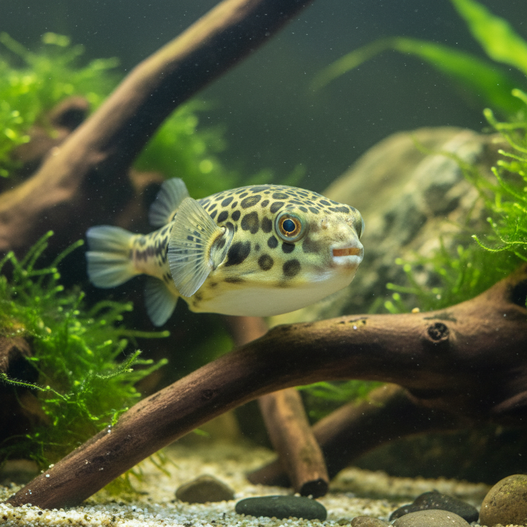 The Green Spotted Puffer (Dichotomyctere nigroviridis) is a highly intelligent, energetic, and aggressive puffer known for its vibrant green back, black spots, and mandatory transition to saltwater as it matures.